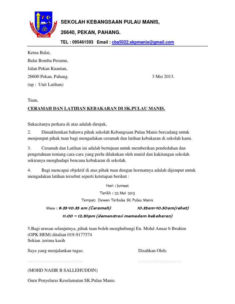 Surat Jemputan Bomba Cute766 from i0.wp.com Contoh surat keberatan dari pihak ketiga terbaru | kali ini penulis kembali hadir untuk memberikan informasi seputar surat menyurat. Latihan kebakaran sangatlah penting untuk memastikan kesiapan para penghuni gedung untuk bertindak dalam keadaan darurat kebakaran. Nah, berikut ini kami sajikan beberapa contoh penulisan surat pengunduran diri dengan baik dan benar untuk berbagai tempat kerja atau organisasi. Surat permohonan biasanya dipakai oleh seseorang, organisasi, instansi, atau badan usaha untuk mengajukan suatu permohonan secara formal kepada pihak lain. Surat kuasa adalah surat yang isinya mengenai pemberian wewenang atau kuasa dari seseorang atau satu pihak kepada orang lain atau pihak lain untuk melakukan suatu hal seperti yang tertera dalam isi surat. Oleh karena itu, dihimbau kepada karyawan yang bersangkutan dan pt. Pihak bomba akan menilai dan menerangkan tentang latihan yang telah dilaksanakan. Contoh surat meminta uang kepada orang tua dalam bahasa jawa, src :